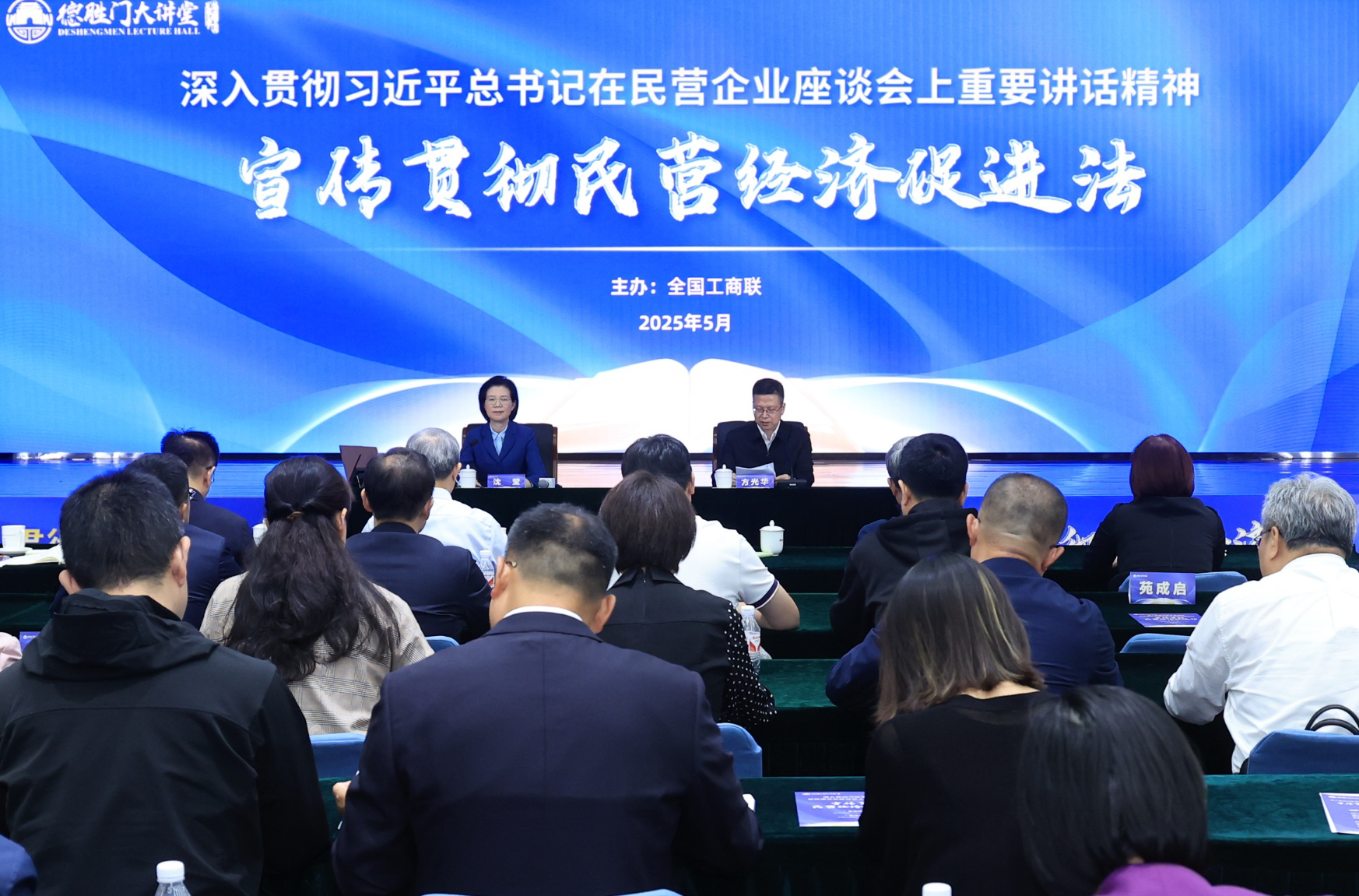 512日下午,全国工商联在京举办深入贯彻习近平总书记在民营企业座谈会上重要讲话精神、宣传贯彻民营经济促进法德胜门大讲堂专题活动。全国人大常委会法工委副主任王瑞贺宣讲解读民营经济促进法,中央统战部副部长、全国工商联党组书记沈莹作总结讲话。全国工商联领导班子成员王受文、安立佳、汪鸿雁出席活动,方光华主持活动。